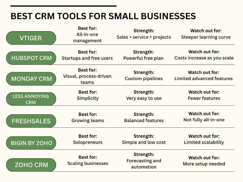 The best CRM for a small business is one that balances ease of use with essential automation. Zoho CRM and HubSpot are top-rated for scalability, while Bigin and Monday CRM are preferred for their visual interfaces and quick setup for smaller teams.